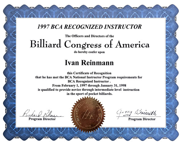 1997 absolvierte ich schließlich die Ausbildung zum Billard-Instruktor beim Billiard Congress of America (BCA). Das war ein wichtiger Meilenstein auf meinem Weg.